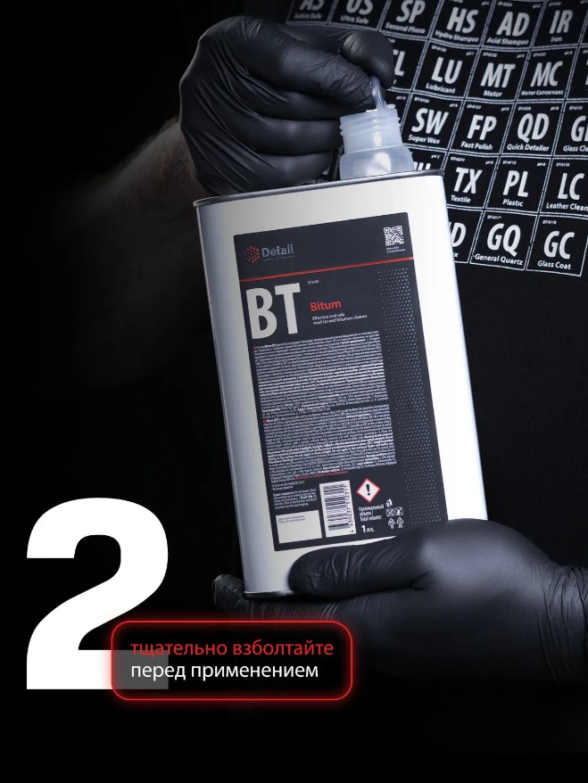 Очиститель кузова Detail для удаления битумных пятен BT Bitum, 1л - эффективный и безопасный очиститель гудрона и битума. Состав значительно упрощает процедуру подготовительной очистки поверхностей, за считанные секунды справляясь с наиболее едкими загрязнениями. Уникальность состава BT «Bitum» в его безопасности для всех наружных поверхностей: лака, стекол, пластика. BT «Bitum» не содержит абразивов, не царапает поверхности и не повреждает слой ранее нанесенных защитных покрытий.