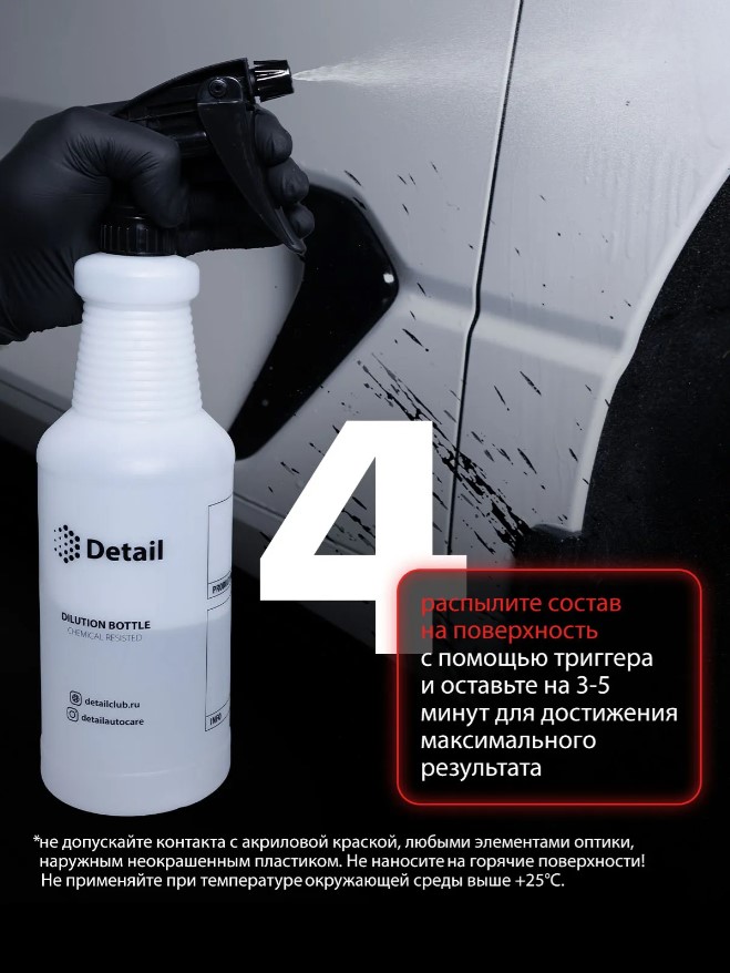 2. Распылите состав Bitum (BT) на обрабатываемые поверхности и подождите 2-4 минуты. При тяжелых загрязнениях необходимо использовать микрофибру.