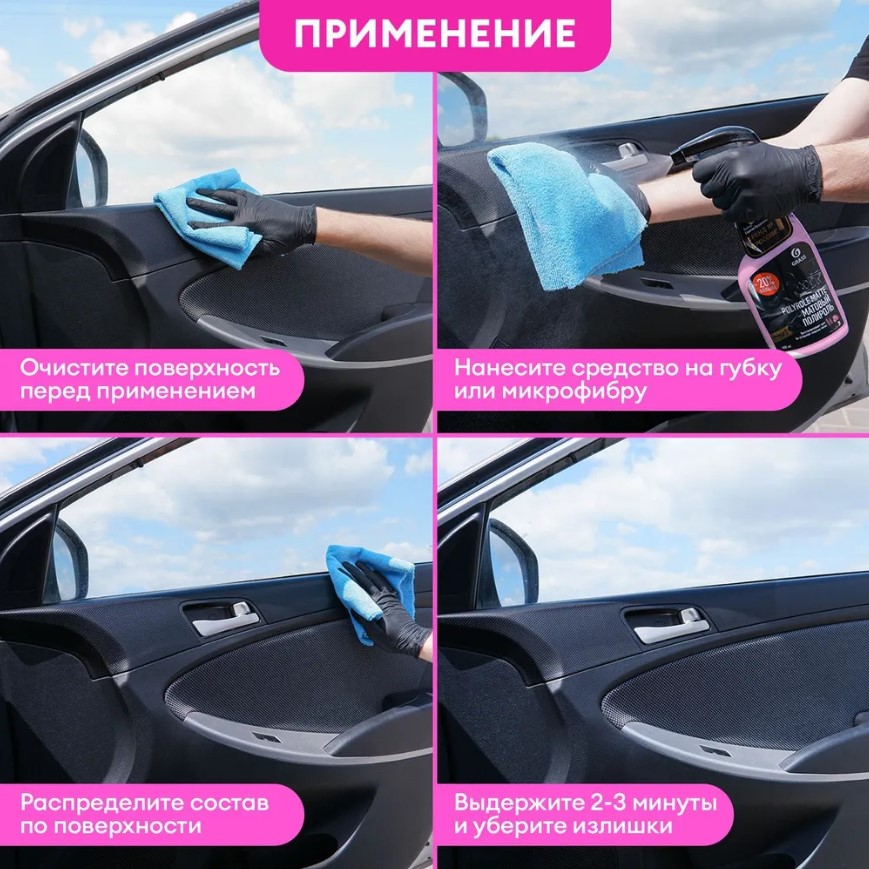 Нанести на поверхность с помощью распылителя или губки, распределить равномерно на поверхности круговыми движениями. Не допускать попадания на стекла и зеркала.