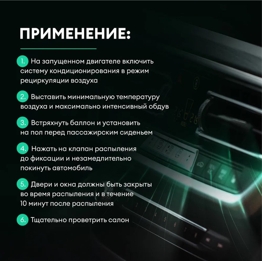 6. Двери и окна автомобиля должны быть закрыты во время распыления и в течение 10 минут после.