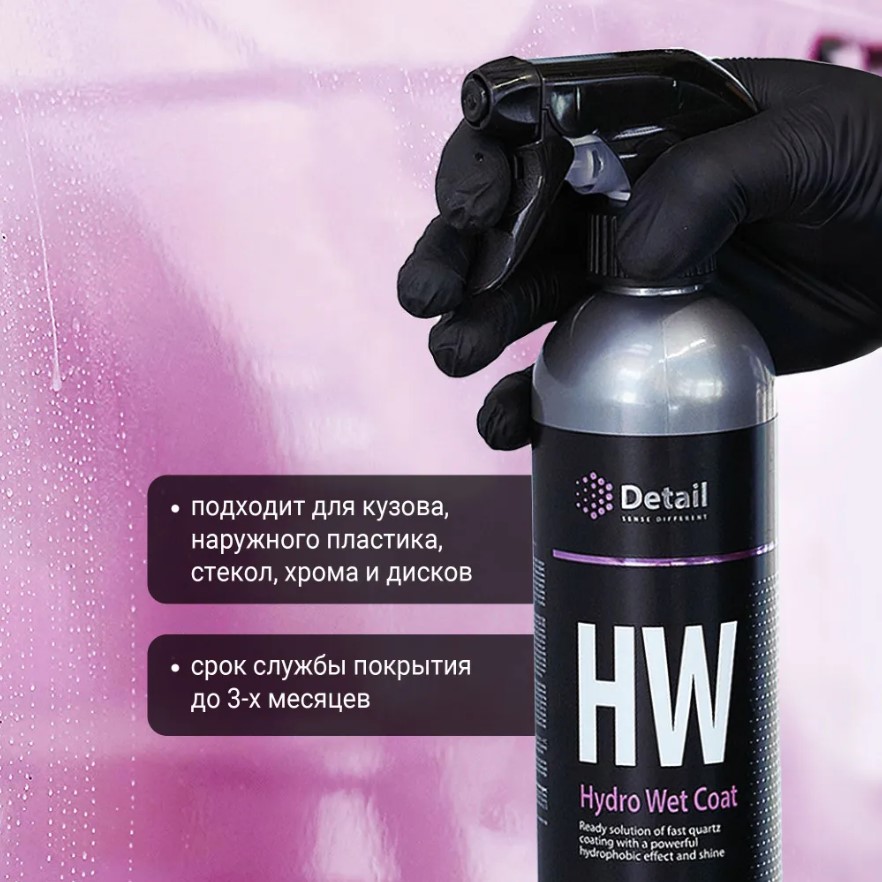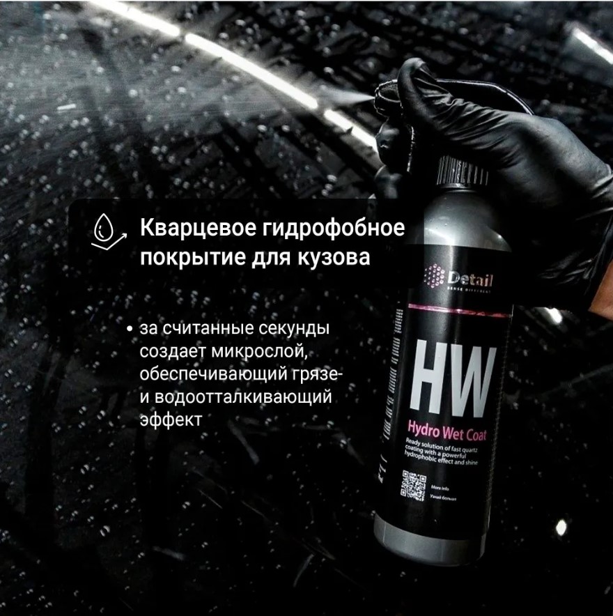 Готовый раствор кварцевого покрытия с мощным гидрофобным эффектом и блеском. HW «Hydro Wet Coat» за считанные секунды создаёт микрослой обеспечивающий грязе- и водоотталкивающий эффект. Инновационное средство разработано для профилактики всех профессиональных защитных покрытий в условиях автомоечного комплекса. Подходит для следующих поверхностей: кузов автомобиля, наружный пластик, стёкла, шины и диски. Средство устойчиво к щелочам и другой агрессивной дорожной химии. Длительный срок службы в отличие от жидких восков - до 3-х месяцев.