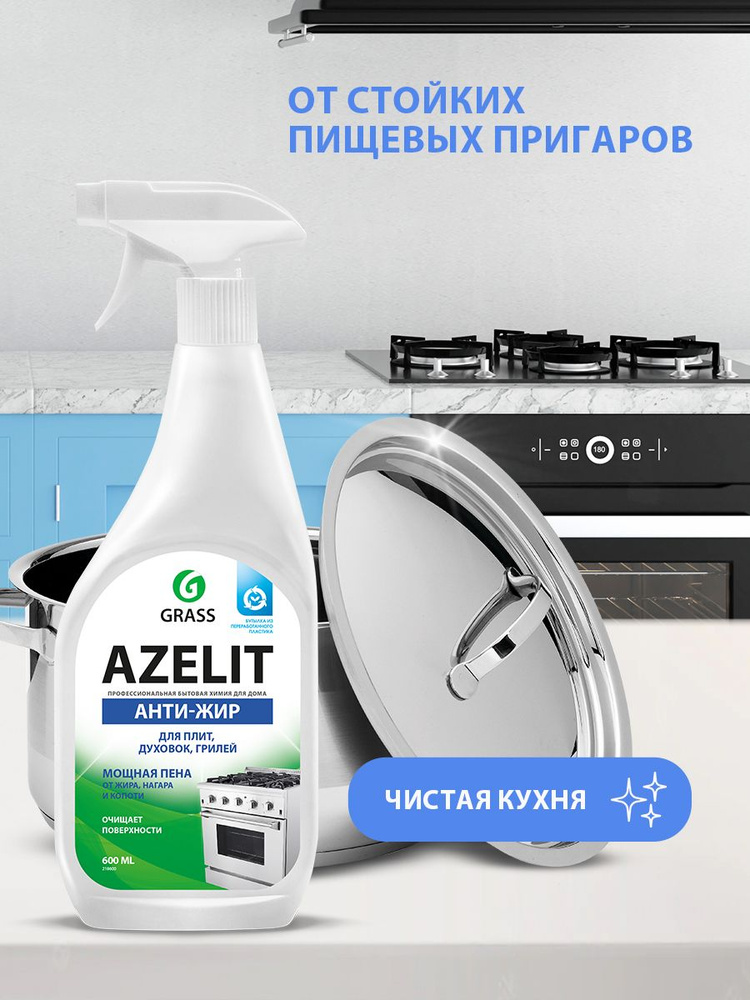 Чистящее средство для кухни Grass «Azelit», 600 мл - эффективное и недорогое средство для удаления жира, нагара и копоти со сковородок, кухонных плит, коптильных камер, фритюрниц, грилей, духовых шкафов, микроволновых печей и др. Содержит активные чистящие вещества, расщепляющие жир, действие которых гарантирует быстрый результат без особых усилий.Флакончик имеет традиционный распылитель на 2 положения, закрыто и открыто, брызгает только струей, распыление не предусмотрено. Ручка удобная эргономичная, подача средства осуществляется по подводящей трубочке.