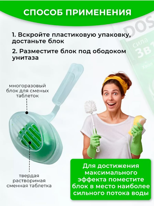 Способ применения: Вскройте пластиковую упаковку, достаньте блок. Для достижения максимального эффекта поместите блок под ободок унитаза в место наиболее сильного потока воды.