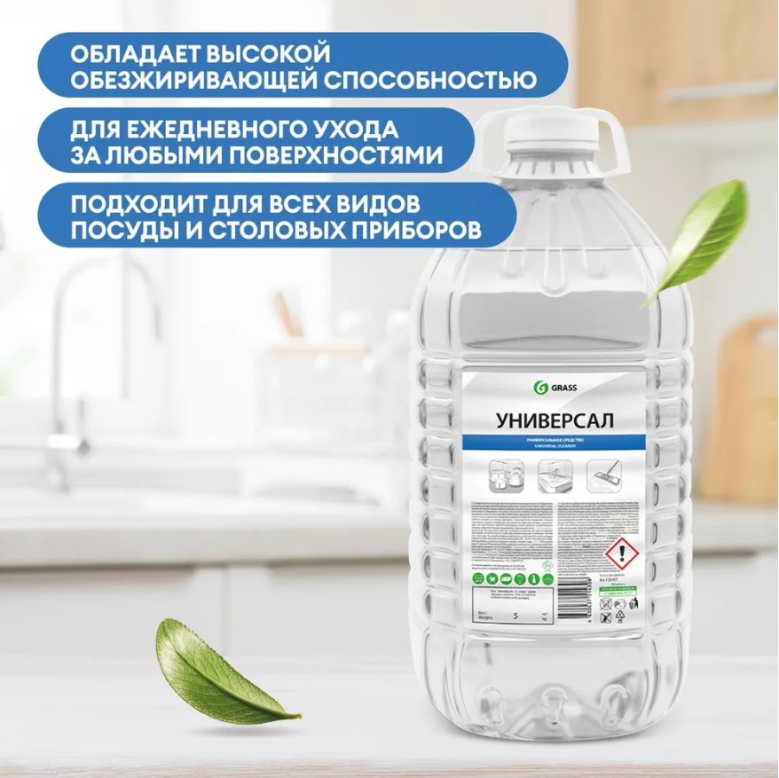 Моющее средство Grass «Универсал», 5 л - универсальное пенное моющее средство с высокой обезжиривающей способностью от компании Grass. Предназначено для ежедневного ухода за любыми моющимися поверхностями, подходит для всех видов посуды и столовых приборов, внутренних и внешних поверхностей бытового, кухонного и производственного оборудования, сантехнического оборудования, стен и полов, синтетических и виниловых покрытий.