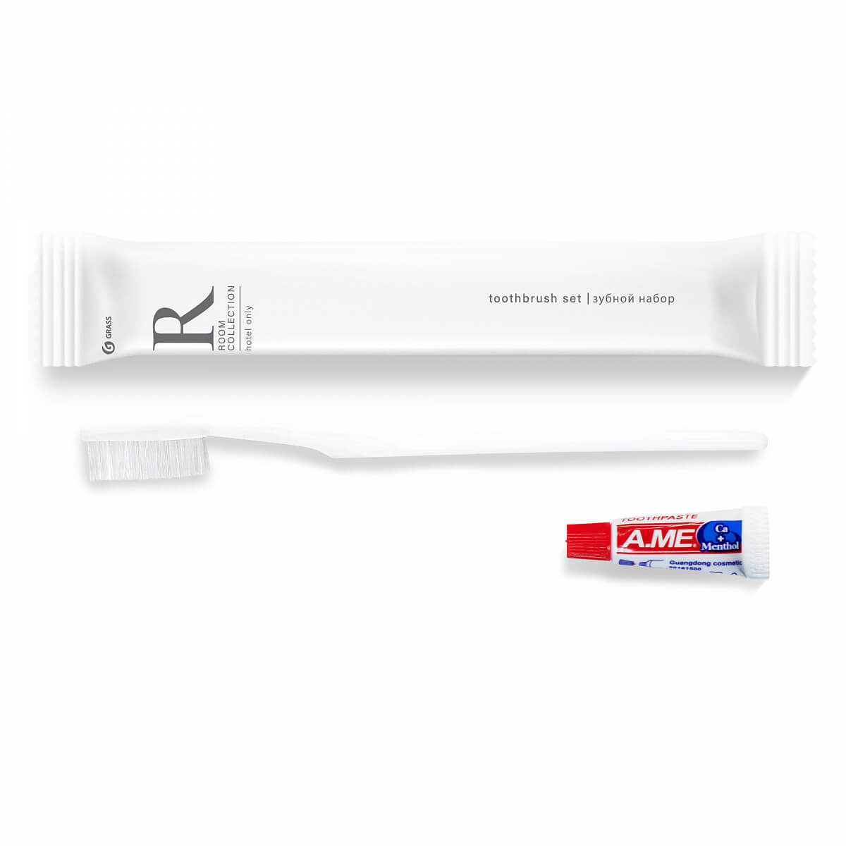 В зубной набор «Room» входят зубная щетка 18 см, зубная паста в тюбике 6 гр (флоу-пак), в упаковке 200 штук.