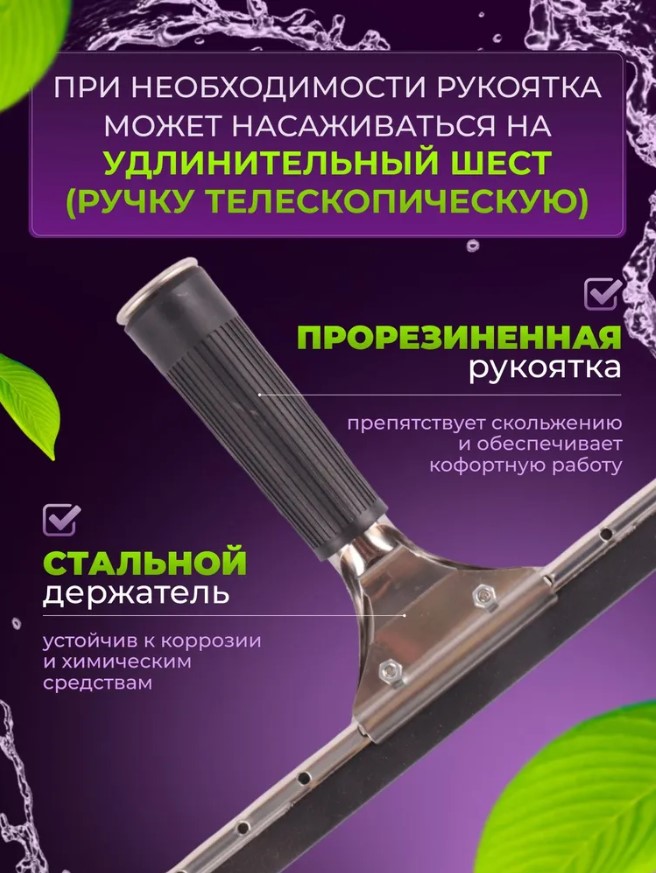 Стяжка предназначена для сгона жидкости со стеклянных поверхностей. Для использования на производстве, а также дома и на обширных поверхностях.