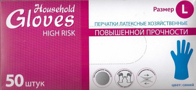 Перчатки латексные High Risk, синие, L, Household Gloves, (50шт/уп)