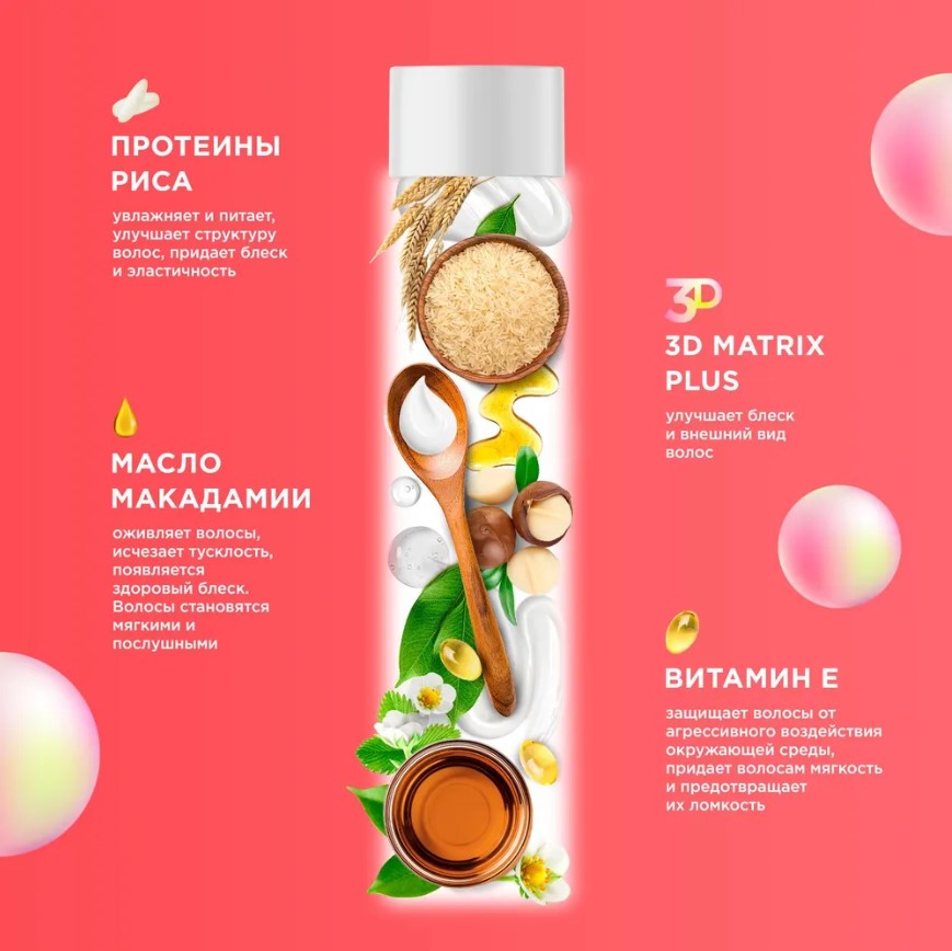 Технология 3D MATRIX+ обволакивает, увлажняет, защищает и восстанавливает волосы по всей длине, благодаря активным натуральным компонентам из протеинов сои и семян рожкового дерева. Протеины РИСА питают волосы микроэлементами и насыщают их влагой по всей структуре волоса. Образуют защитную пленку, препятствуют вымыванию цвета. Масло макадамии насыщает волосы влагой, оживляет их. Предотвращает возникновение тусклости, придает волосам здоровый блеск. После применения волосы становятся мягкими, приятными на ощупь