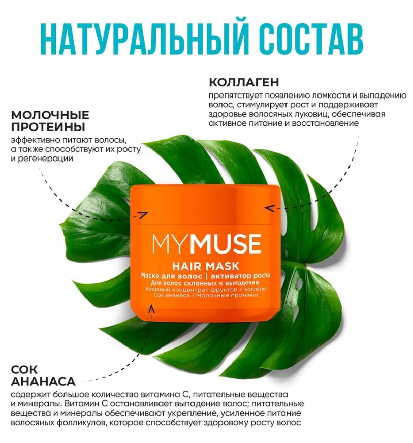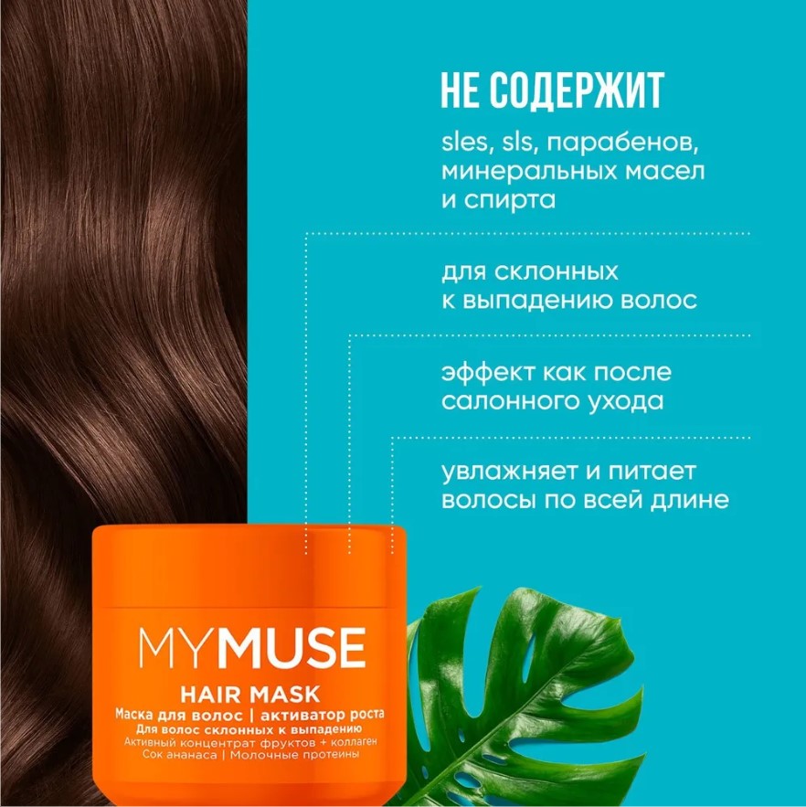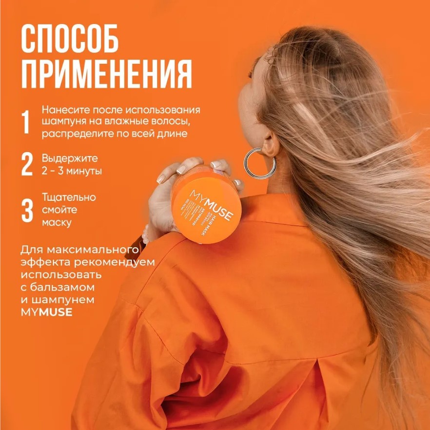 Использовать после шампуня. Нанесите на влажные волосы по всей длине, втирайте массирующими движениями в течение 2-3 минут, тщательно смойте. Рекомендуем использовать с шампунем MyMuse.