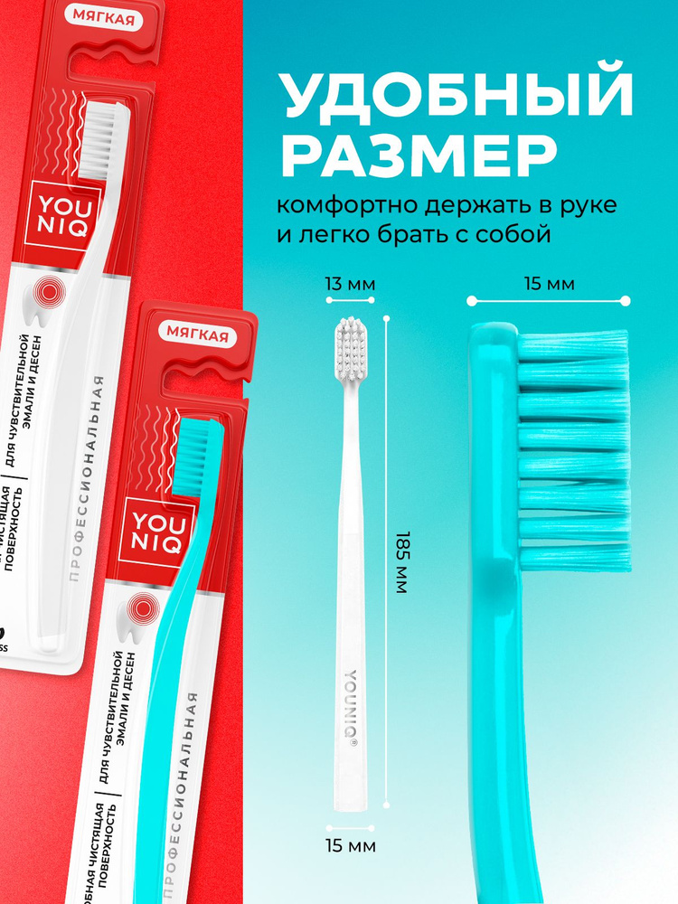 Разработана для обеспечения эффективной и бережной гигиены полости рта. Зубная щетка мягкой жесткости YOUNIQ бережно удаляет налет и остатки пищи, не травмируя десны.
