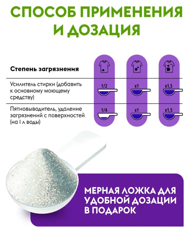 Экологичный пятновыводитель для белья быстро и эффективно справляется с удалением различных видов загрязнений: травы, вина, крови, фломастера, гуашь, чернил, масла, жира, плесени, пота. Универсальный очиститель с мерной ложкой бережно отбеливает, устраняет запах, подходит для цветного, детского, черного и белого белья. Усиливает действие порошка, геля, таблеток, капсул, а также другие средства для стирки. Подходит для легкой химчистки ковров, мягкой мебели и текстиля. Мощное чистящее средство на основе сильнодействующего кислорода для выведения пятен не содержит хлор, фосфаты и красители. Безопасен для окружающей среды и животных. Не используйте для очистки изделий из шерсти, шелка, кожи, пуха и пера, мембранных тканей, меди, алюминия. При использовании пятновыводителя цветное и белое бельё необходимо стирать отдельно.